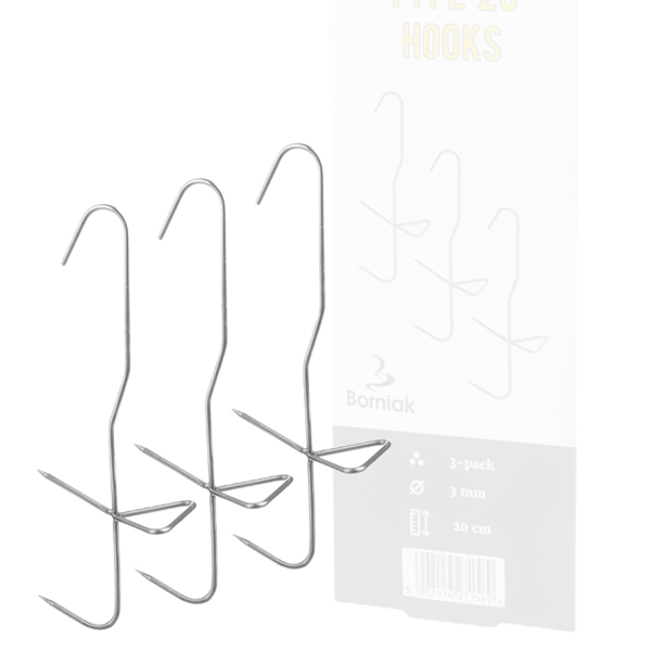 Die Haken von Borniak mit Spreizfunktion sind das ideale Werkzeug für das Räuchern von Fisch. Diese hochwertigen Haken wurden speziell entwickelt, um sicherzustellen, dass der geräucherte Fisch von außen und von innen perfekt gelingt.