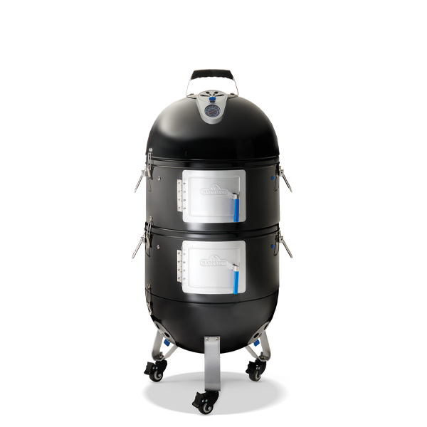 3-in-1 Konzept: klassisch direkt grillen, als Water-Smoker mit Wasserschale smoken oder als „Dry Smoker“ betreiben. Latches verriegeln die Segmente sicher, Türen je Stacker geben schnellen Zugriff auf Kohlekorb & Wasserwanne.