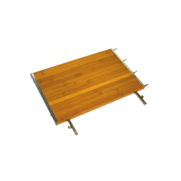 Die Bambus-Seitentische werden mittels der vier mitgelieferten Halterungen am Modell LeChef befestigt. Stellen Sie sicher, dass die Halterungen fest sitzen, bevor Sie die Tische darauf legen.