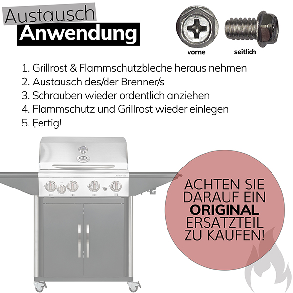Beim Austausch des Brenners sollten Sie sicherstellen, dass der Grill ausgeschaltet und vollständig abgekühlt ist. Arbeiten Sie niemals an einem heissen Grill und stellen Sie sicher, dass alle Gasverbindungen sicher sind.
