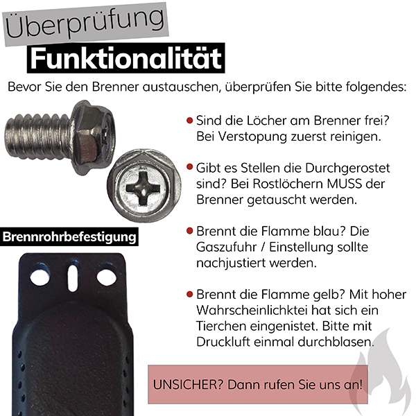 Ein Austausch ist nötig, wenn der Brenner sichtbare Risse, starke Roststellen oder Verformungen aufweist, die die Funktion beeinträchtigen können. Regelmässige Inspektion hilft, solche Schäden frühzeitig zu erkennen.