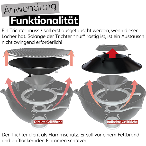 Wenn dein Grill an Leistung verliert, liegt es oft am Trichtersystem. Rost, Materialermüdung oder Hitzeverzug beeinträchtigen die Funktion – die Hitze verteilt sich ungleichmäßig, das Grillergebnis leidet.