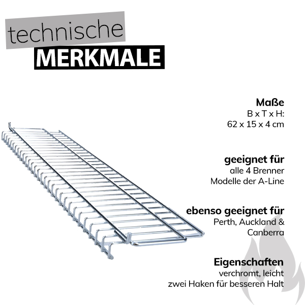 Der verchromte Warmhalterost passt für alle 4-Brenner Modelle der A-Line von Outdoorchef. Ebenso passt er auf die Vorgängermodelle wie Canberra, Perth und Auckland und ist somit für die neue Generation als auch für die alten Modelle von Outdoorchef eine tolle Ergänzung für deinen Grill.