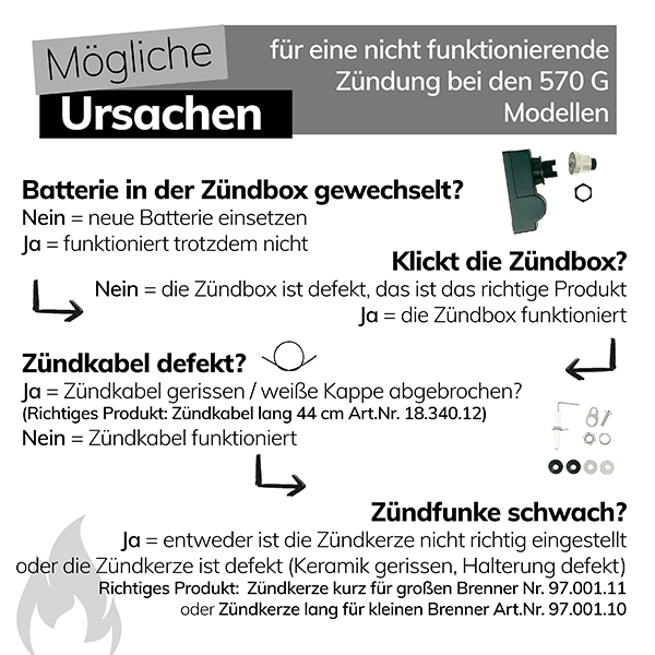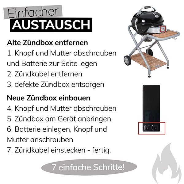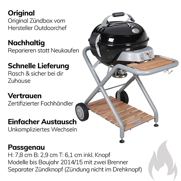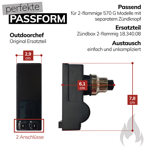 Die Zündbox für 2 flammige Gasgriller von Outdoorchef passt für Griller mit 57 cm Durchmesser. Wenn die Box beim Drücken des Knopfs nicht mehr klickt, bitte zuerst die Batterie austauschen. Sollte mit der neuen Batterie immer noch kein Klickgeräusch zu hören sein, ist die Zündbox defekt und muss ausgetauscht werden.