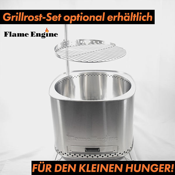 Mit dem optional erhältlichen Grillaufsatz wird die Feuerschale im Handumdrehen zum praktischen Grillgerät. So lässt sich die Wärmequelle flexibel auch zum Zubereiten von Speisen nutzen. Damit eignet sich die Flame Engine Buddy sowohl für den Campingurlaub als auch für den Familienabend im eigenen Garten.