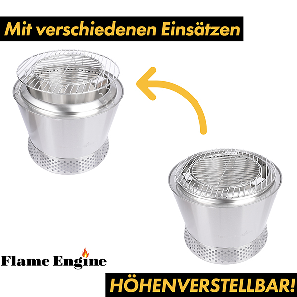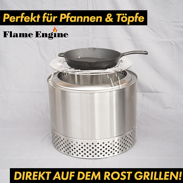 Genieße die wohltuende Wärme der rauchfreien Feuerschale, zeitgleich das schmackhaft zubereitete Grillgut auf dem Edelstahl Grillrost von Flame Engine.