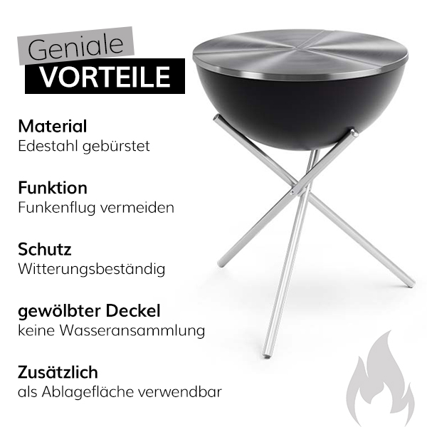 Der BOWL 70 Edelstahldeckel minimiert die Gefahr von Funkenflug und sorgt dafür, dass glühende Asche sicher in der BOWL bleibt. Dies erhöht die Sicherheit beim Grillieren erheblich.