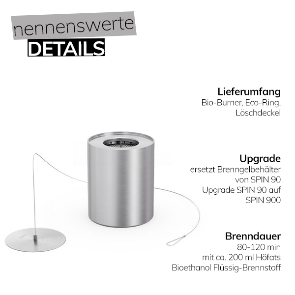 • Upgrade von SPIN 90 auf SPIN 900</strong durch Austausch des Brenngelbehälters.