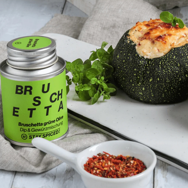 SPICEWORLD-Tipp: Bereiten Sie Wasser und Olivenöl in gleichen Teilen vor, mischen Sie das Bruschetta Gewürz bei und verrühren Sie die Zutaten zu einer homogenen Paste. Nach Belieben mit Mandeln, Parmesan und Frischkäse verfeinern.