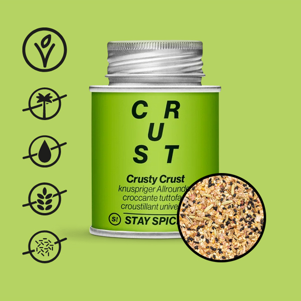 Himalayasalzflocken, Schalotten, Ahornsirup, Fenchel, Cumin, Knoblauch – und schwarzer & weißer Sesam: Diese Mischung solltest du dir genau merken. Nein, eigentlich nicht … denn wir haben das für dich getan, und daraus kurzerhand ein geniales Gewürz gezaubert, das seinem Namen mehr als gerecht wird. Der knusprigke Allrounder STAY SPICED ! Crusty Crust hält nämlich, was sein Name verspricht: Knusprigkeit hoch zehn!