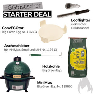 Big Green Egg MiniMax Keramikgrill EGGtastischer Starter Deal mit Big Green Egg Grill Zubehör Mini Kamado mit Kohle, ConvEGGtor, Ascheschieber und Looftlighter Big Green Egg Artikelnummer AMXHD3