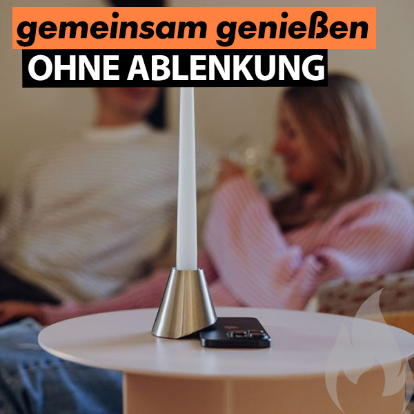 Der Kerzenhalter steht von Natur aus schräg und richtet sich erst dann auf, wenn ein Smartphone darunter geschoben wird. Dies signalisiert visuell: „Jetzt ist Fokus auf das Gegenüber, nicht auf das Display.“