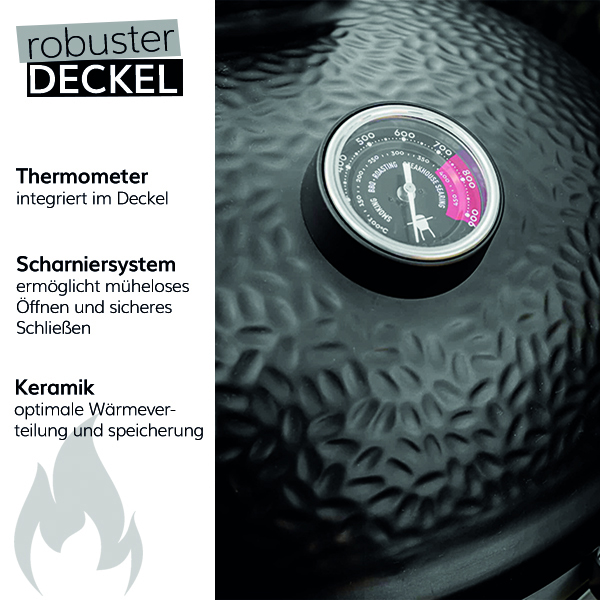 Das markante Merkmal der Avantgarde Serie ist zweifellos die Satin-Matt Mineralglasur, die nicht nur eine elegante Optik bietet, sondern auch langlebig und pflegeleicht ist. Das überarbeitete Gestell wurde speziell entwickelt, um die neuen Seitentische aus Heavy Bamboo zu halten, die nicht nur eine natürliche Schönheit bieten, sondern auch äußerst funktional sind. Für noch bessere Stabilität und eine beeindruckende Ästhetik haben wir dickere Edelstahlbeschläge verwendet, die nicht nur das robuste Erscheinungsbild unterstreichen, sondern auch die Langlebigkeit des Grills gewährleisten. Ein weiteres Highlight ist das im Griff integrierte LED-Licht, das die gesamte Grillfläche bei Dunkelheit optimal ausleuchtet. So können Sie auch nach Sonnenuntergang perfekt grillen und Ihre kulinarischen Kreationen im besten Licht präsentieren.