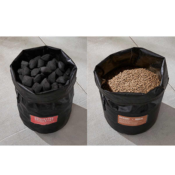 Wasserabweisend mit einem Fassungsvermögen von 9kg Pellets oder Holzkohle. Kann klein zusammengefaltet werden. Mit einer durchsichtigen Vordertasche um einen Zettel mit Beschriftung des Inhaltes einzustecken.