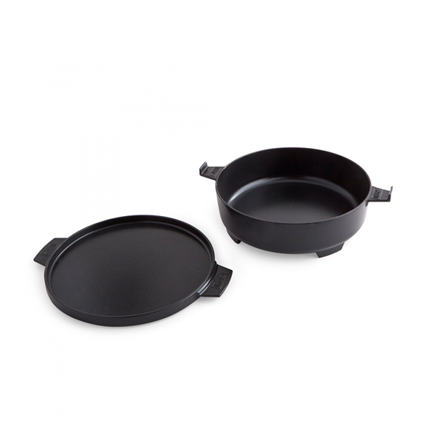 Traditioneller Dutch Oven mit flachen Deckel, der gleichzeitig als Pfanne genutzt werden kann. Aus emailliertem Gusseisen mit seidenmatter Beschichtung für eine einfache Reinigung. Praktische Befestigung innerhalb des GBS-Rost. Gleichzeitig mehr Grillmöglichkeiten.