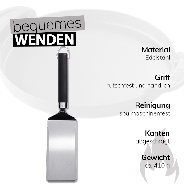 • Die abgeschrägte Kante gleitet aus jedem Winkel unter das Grillgut